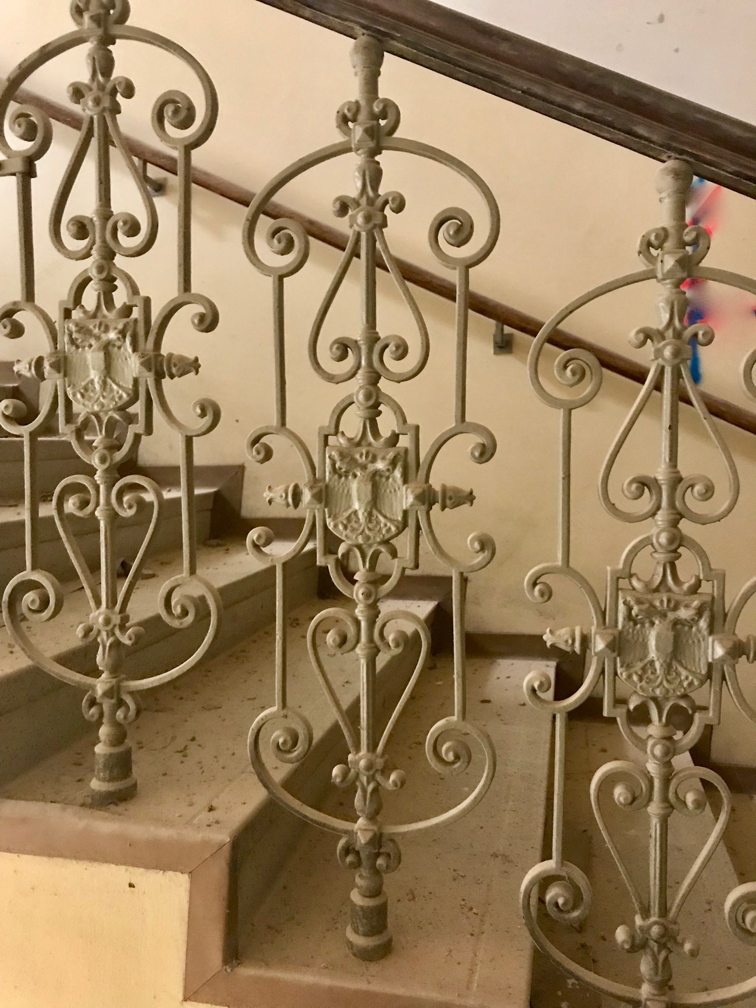 Sei es die mittige Kartusche mit Österreichischem Doppeladler oder das stattliche Gewicht von 12 kg pro Geländerelement– die stellen schon was dar diese Stäbe. War das Dessin dieser Stäbe vielleicht Ausdruck der Liebe zum Kaiserhaus, eine Bekenntnis zur Monarchie? Wollte der ehemalige Bauherr seinen gesellschaftlichen Stand damit hervorheben? Oder gar erhöh'n? War der Doppeladler eigentlich eine "Geschützte Marke", oder erhielt die Eisengießerei eine Sondererlaubnis zur Fertigung dieser Geländerstäbe? Tja, man (also ich) weiß es nicht genau ... Die gußeisernen Geländerstäbe stammen aus einem Wiener Mehrparteienhaus, welches 2 Stiegenaufgänge hatte. Bei beiden Treppen waren Geländer mit dem Doppeladler verbaut, wobei es 2 leicht variierende Modelle gibt. Vom Modell "Geh'n S Ketterl" gibt es ca. 50 Stück. Vom 2.Modell gibt es ca. 20 Stück.