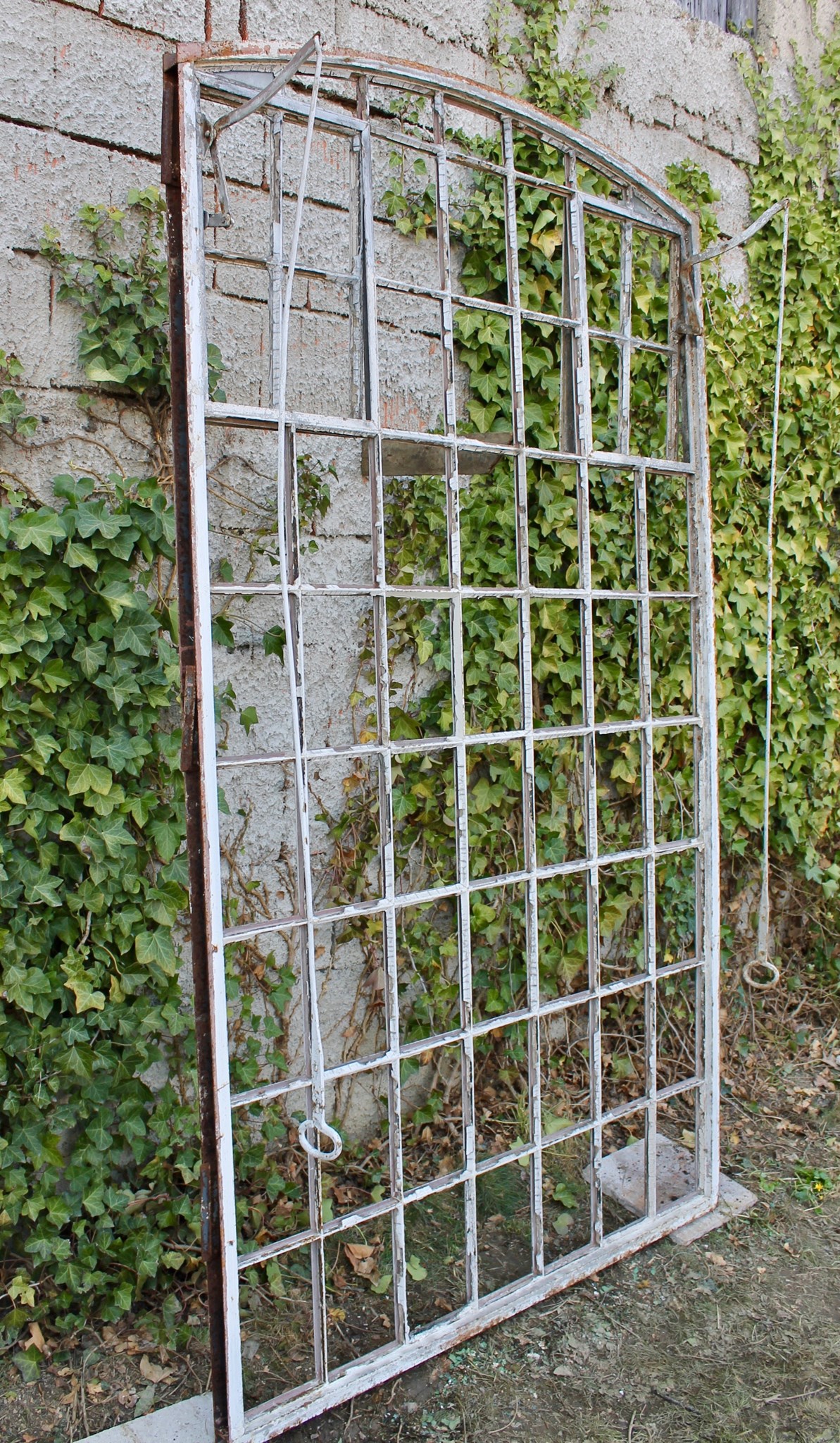 Dieses ehemalige Fabriksfenster besticht durch 63 Einzelscheiben, eine relativ flache Segmentbogenform und einen raffinierten Lüfterflügelöffnungsmechanismus nach Hampelmann-Manier. Hebt ein Spielzeug-Hampelmann bei Schnurzug keck Beinchen und Arme hoch, so hebt unser Eisenfenster bei Stangenzug ganz kokett die Lüfterklappen. Dieser Mechanismus ist einerseits natürlich praktisch und sieht aber auch recht spektakulär aus, so technisch. Aus einer Zeit, in welcher die Technik noch in all ihrer Rohheit zu sehen sein durfte. Brachial, robust, verlässlich. Hier wird dem Betrachter die nackte Hebelwirkung vor Augen geführt. Schonungslos und bar jeder Furcht vor unbeabsichtigtem Einklemmen oder Verhaken. Und wir, die wir uns sehnen nach dem Echten, wollen mit festem Griff die Eisenstange fassen, selbst wenn der Rest der Welt seine Fenster nur mehr per Smartphone-Wisch öffnet ... Die Originalverglasung konnte leider nicht erhalten werden, die Fenster müssen also neu verglast werden.